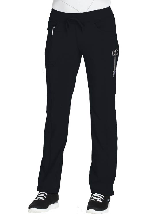 A Contemporary fit, low rise, straight leg pant features an elastic knit waistband and adjustable drawstring. Also featured are rib knit front and back yokes, angled front pockets, front leg seams with a zip closure cargo pocket, one back patch pocket, a bungee instrument loop below left pocket, a bungee cord with a toggle at the leg hems for adjustability and cover stitch detail throughout. Inseam: 31″ The comfortable stretch poplin fabric and super stretchy rib knit is the perfect combo for healthcare professionals.